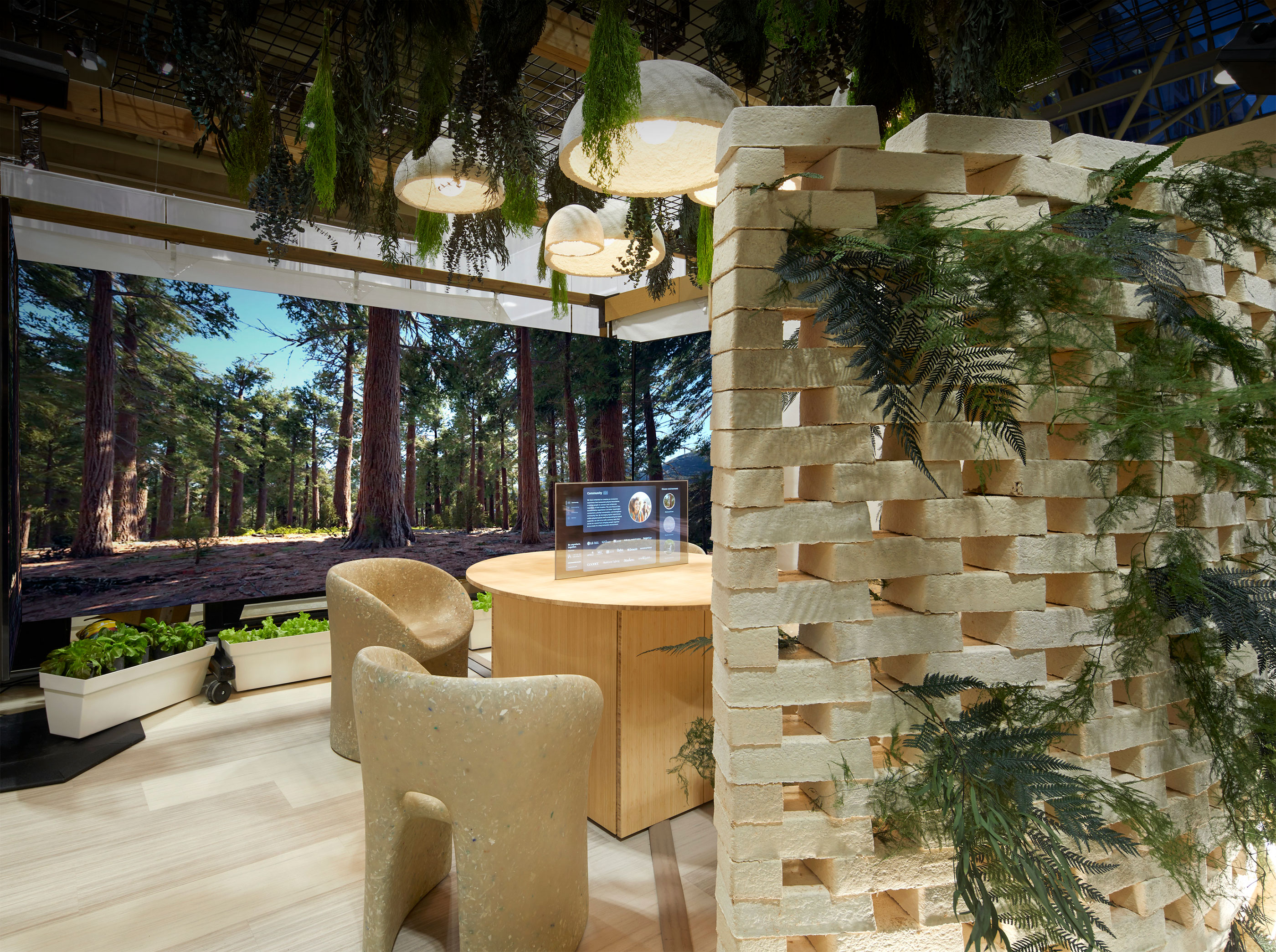 The immersive environment engages all the senses. By utilizing digital experiences, we transformed the space to suit different activities, and by incorporating bio-based materials, we created a rich and stimulating sensory experience. Using a blend of cutting-edge display technology within this immersive space added a touch of wonder, enhanced storytelling, and sparked conversations among participants.