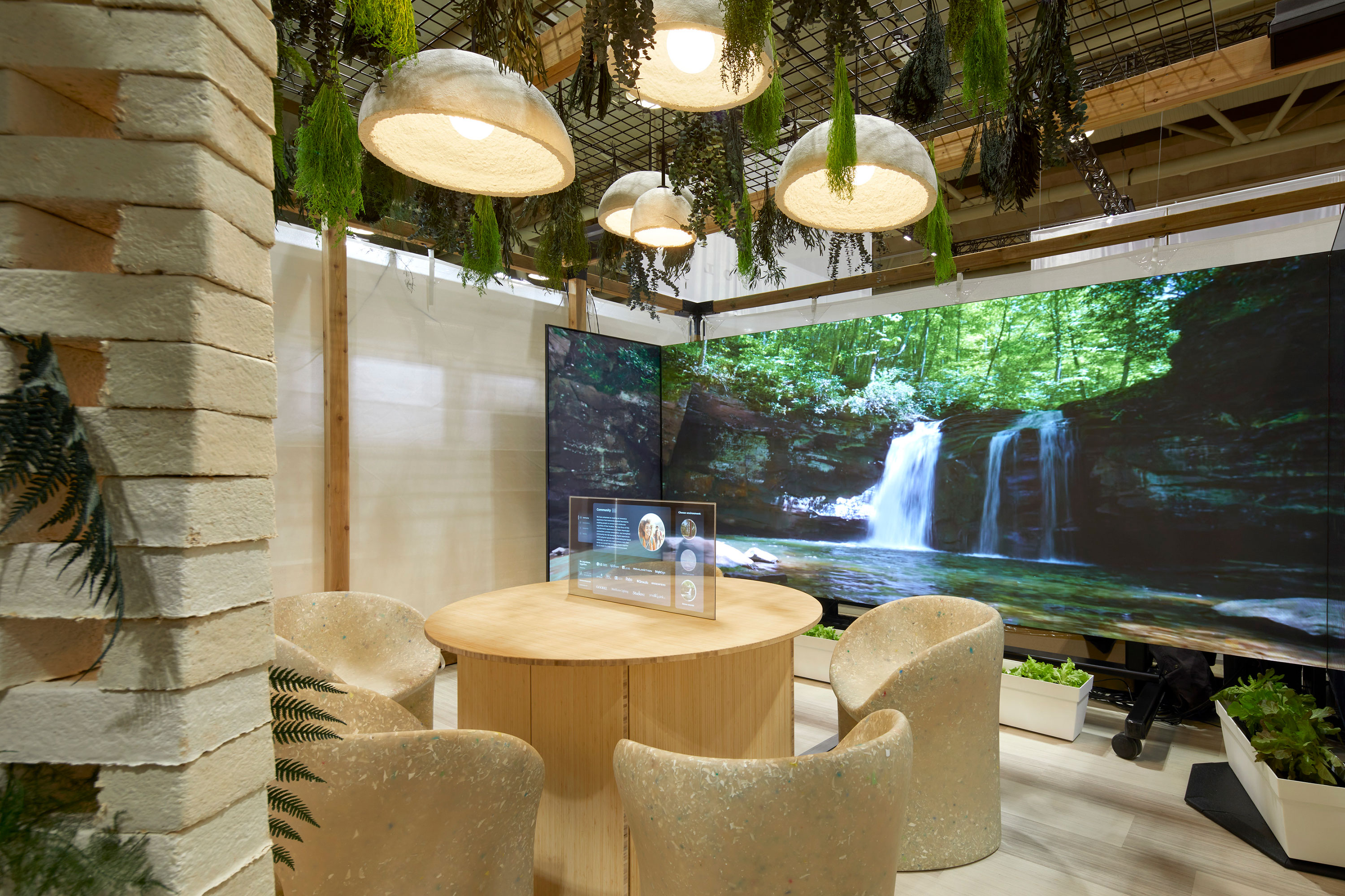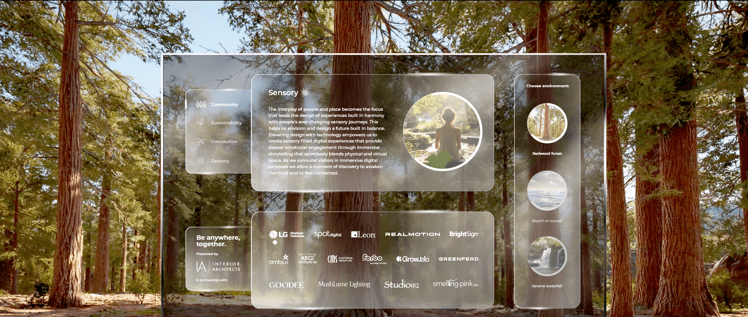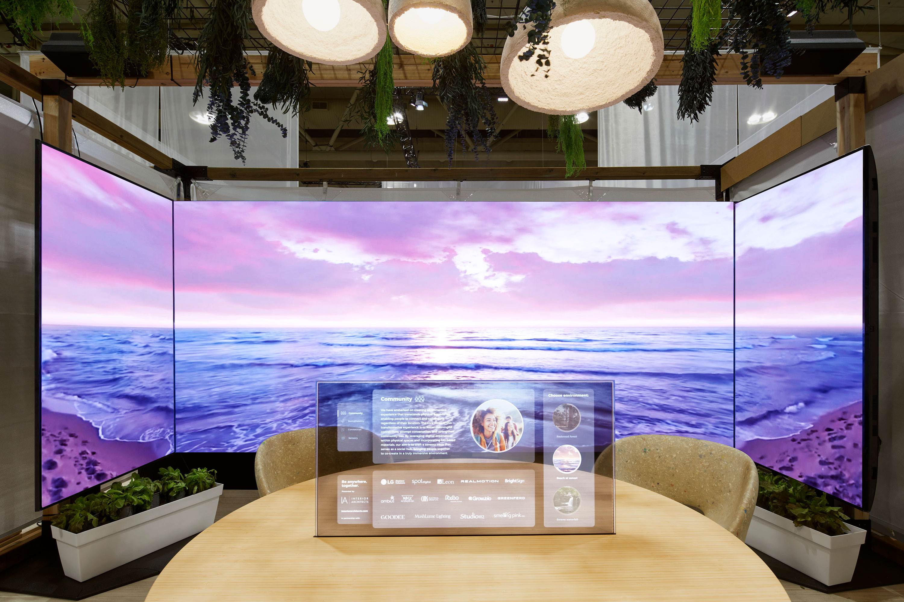 Our Be Anywhere. Together. booth puts this into practice with a sensory, healing, and transformative experience that explores the intersection of technology and sustainability. Here, technology surrounds and immerses you in nature as we dive into four key elements: Connection, Community, Sensory, and Sustainability.