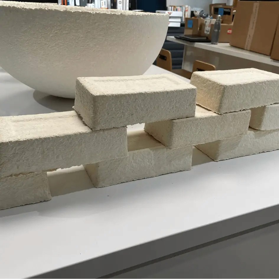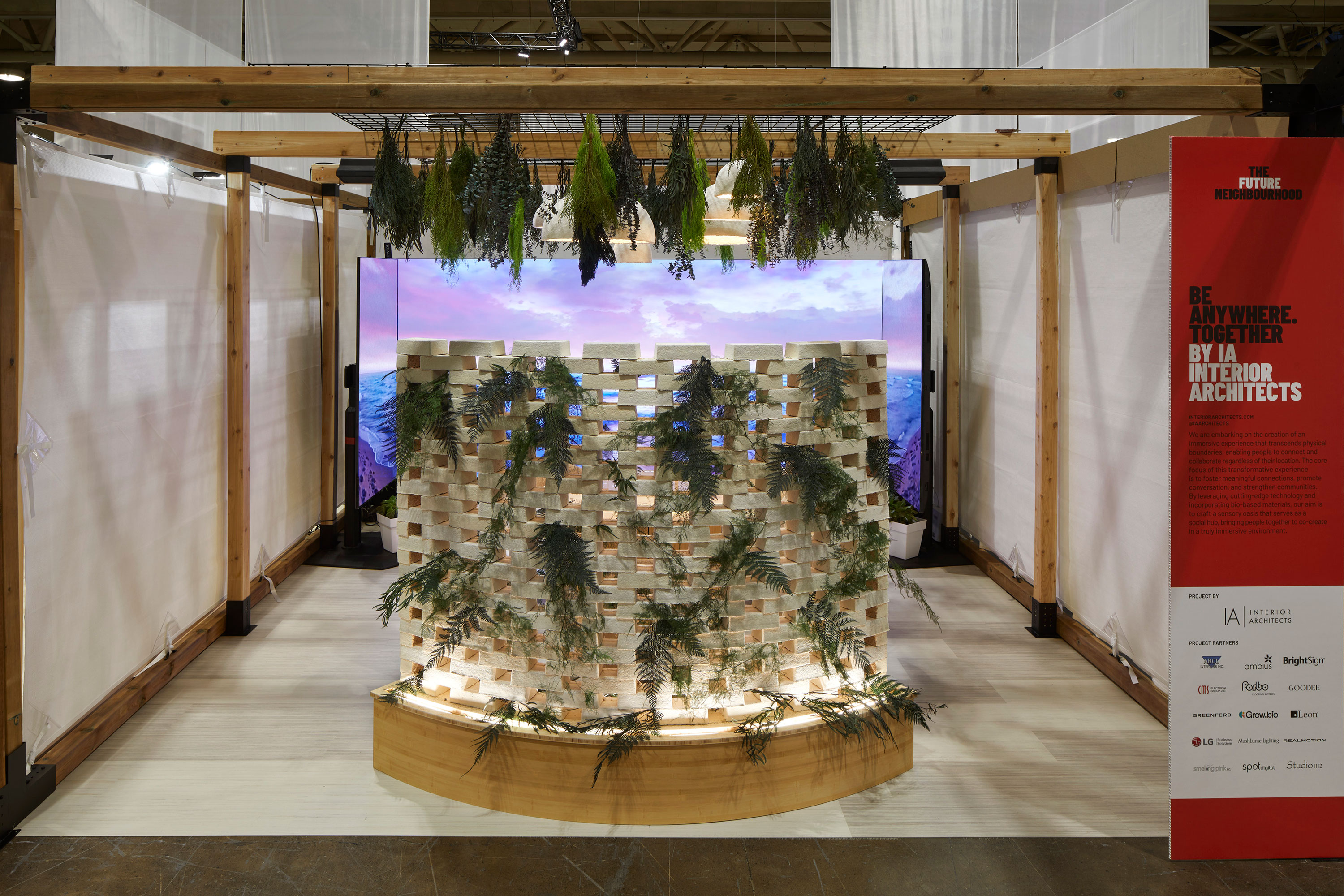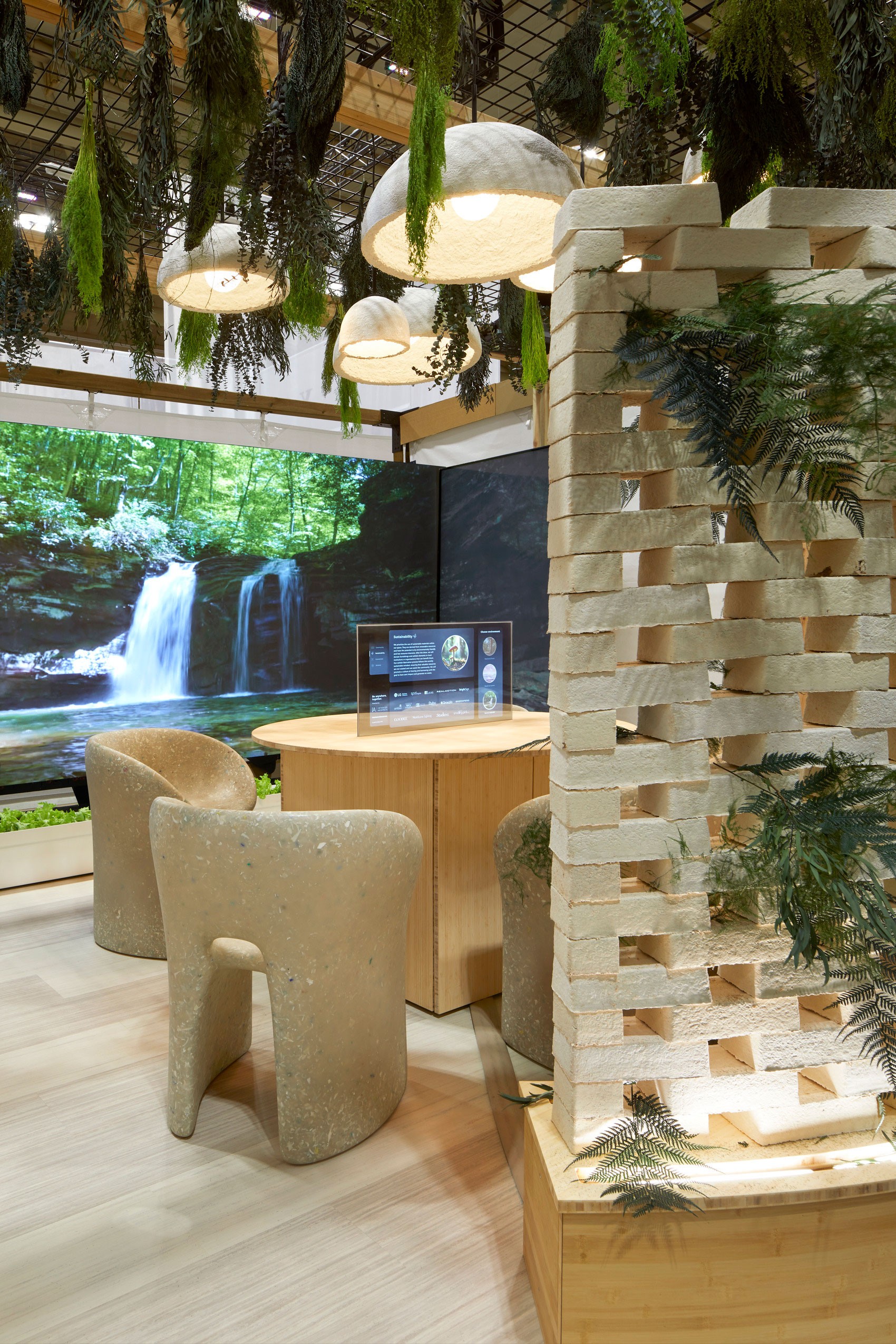 The exhibit had non-stop traffic throughout the 4-day event. The mycelium brick wall sparked curiosity and provided an entry point to approach the booth, touch the innovative material, and initiate immediate curiosity. The beautiful digital canvases behind the wall visible through the openings between the bricks invited visitors to come around and enter the booth. Then the innovative multi-display interactive experience captivated visitor’s.